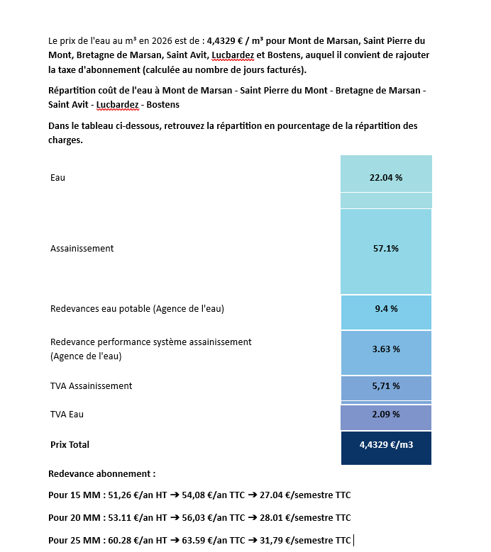 Le prix du mètre cube d'eau, celui de l'assainissement ainsi que la taxe d'abonnement sont fixés par le Conseil d'Agglomération. Les taxes "Lutte contre la pollution" et "Modernisation des réseaux de collecte" sont fixées par l'Agence de l'eau Adour-Garonne".